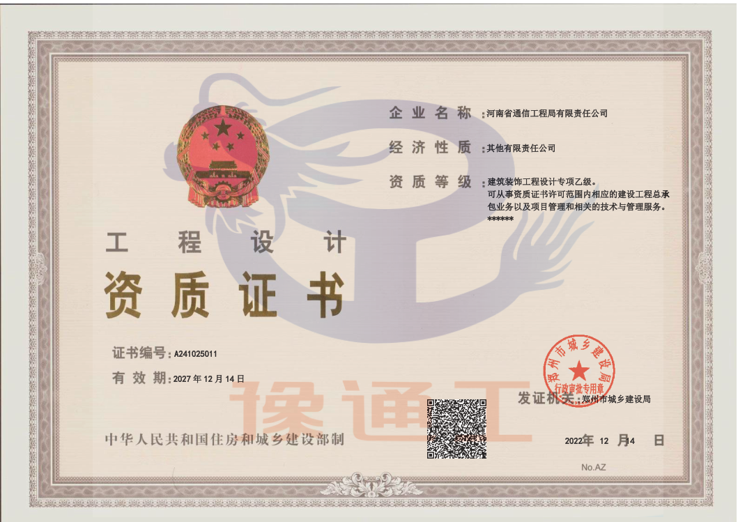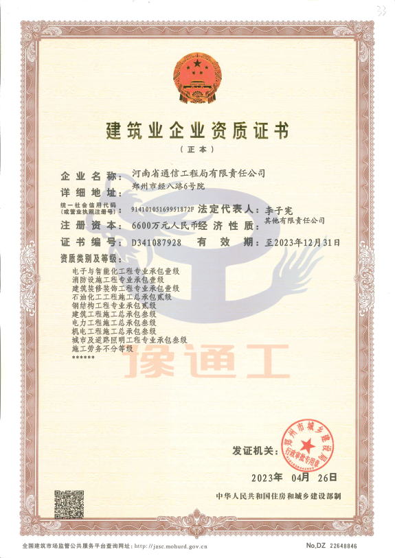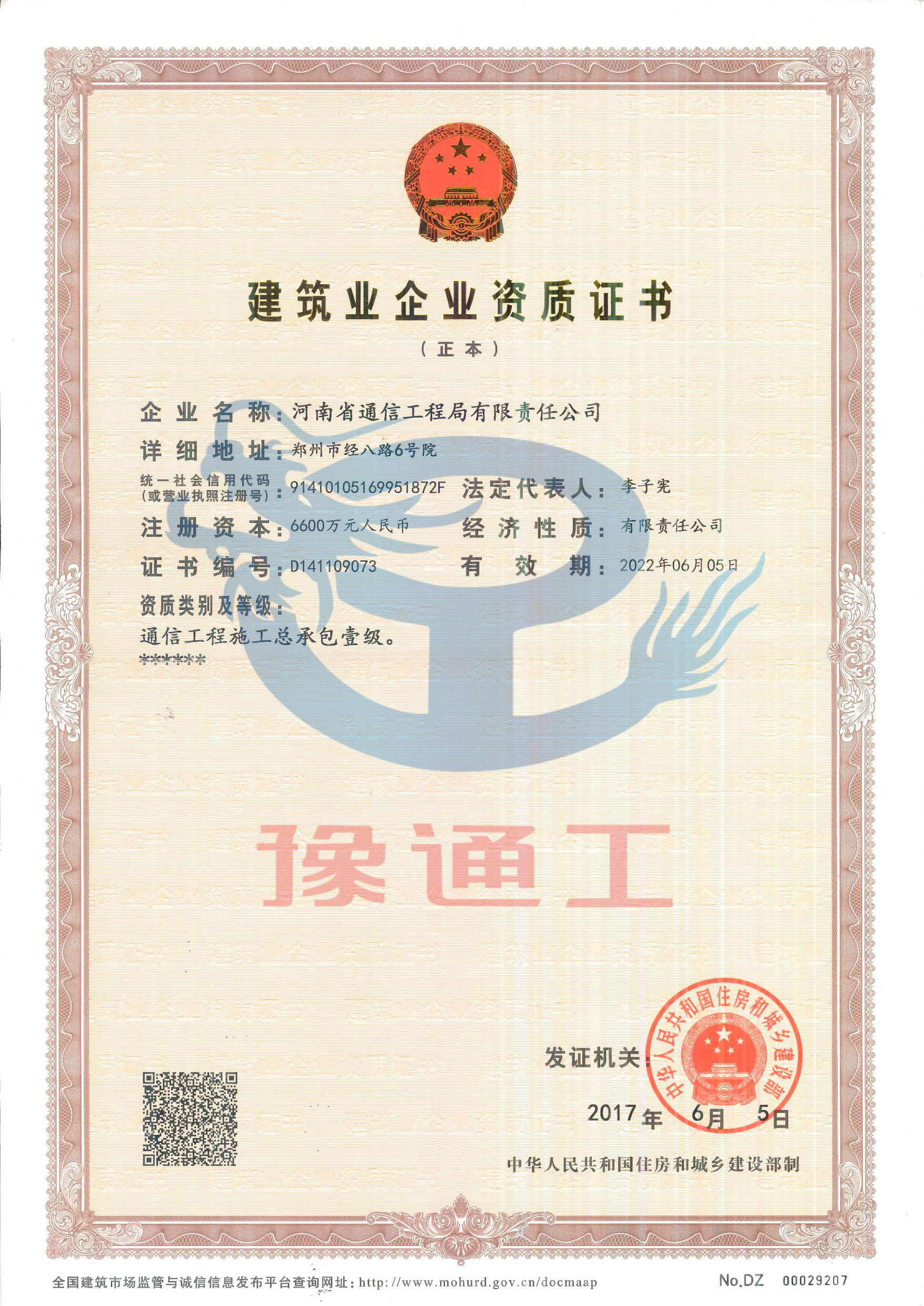 電子與智能化、建筑裝修裝飾、消防設施工程專業(yè)承包壹級;鋼結(jié)構工程專業(yè)承包貳級;建筑工程、電力工程、機電工程、城市及道路照明工程專業(yè)施工總承包叁級;施工勞務不分等級。